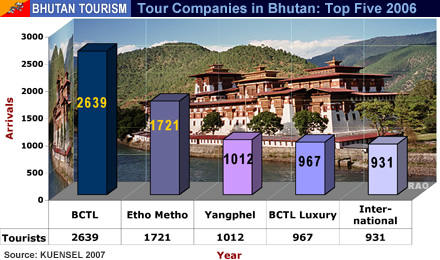 "For all that reasons we are charging our tourists more than the base price of US $ 200 a person a day. An official from one of the big tour companies said that undercutting was prevalent both among the big and small tour operators. He said that they did extend commissions to the agents beginning with 10 percent, which increased to 20 and 30 percent depending on the business generated by the agents. Discounts were also given depending on the size of the group and duration of stay. The managing director of Etho Metho tours and treks, Dago Beda, however, argues that undercutting was not feasible in the present context where hotel rents had shot up, transportation costs had increased and there were more tour operators. "For all that reasons we are charging our tourists more than the base price of US $ 200 a person a day. So there is no question of under cutting," said Dago Beda. "That's an old story." The tourism department's director general, Lhatu Wangchuk, also believes that undercutting may not be feasible, especially, with hotel standards having gone up. He