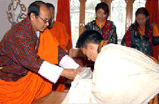 Prime Minister Lyonpo Yeshey Zimba awards a cash prize to archer Tashi