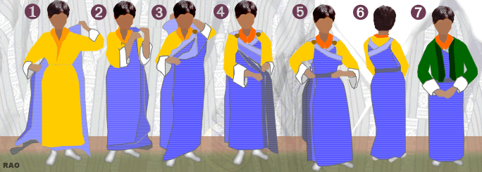 cloth is gathered under the left arm and wrapped around the back to the