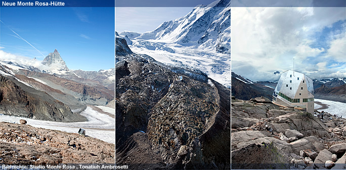 Die Neue Monte Rosa-Hütte auf 2883 Metern über Meer ist der wohl komplexeste Holzbau, der zurzeit in der Schweiz steht. Verkleidet mit einer silbern schimmernden Aluminiumhülle sowie einer in die Südfassade integrierten Photovoltaikanlage, produziert sie Strom. Das Gebäude soll sich zu mindestens 90 Prozent selbst mit Energie versorgen. Im Gelände aufgestellte Solarkollektoren gewinnen solare Wärme. |