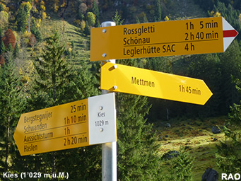 | Signalisation: gelbe Wegweiser mit weiss-rot-weisser Spitze, weiss-rot-weisse Markierungen |