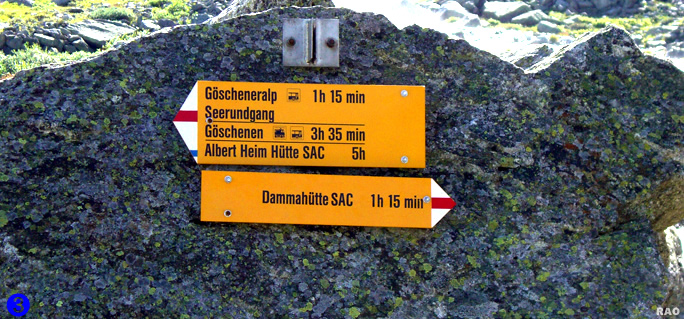 Wegweiser bei der Brücke über die Dammareuss (auf dem Weg zur Dammahütte)