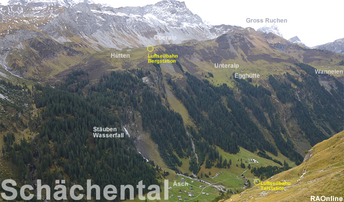 • Die Talstation der Seilbahn ist in einem 45 Minuten dauernden Fussmarsch auf einer Naturstrasse ab der Posthaltestelle Ribi (1 km östlich von Unterschächen) oder vom Klausenpass her auf dem talwärtsführenden Wanderweg erreichbar.