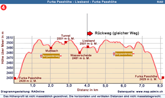 Auf dieser Wanderung gibt es keine ausgebauten Rastplätze oder Verpflegungsmöglichkeiten. Auf dem Furkapass stehen Parkplätze zur Verfügung. Das Postauto fährt täglich zweimal aus beiden Richtungen über den Furkapass. Für die Wanderung wird eine bergtaugliche Wanderausrüstung und eine ansprechende Kondition vorausgesetzt. Der Wanderweg ist gut begehbar und stellt keine aussergewöhnlichen Anforderungen. |