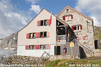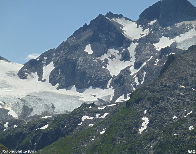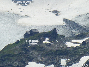 Am oberen Ende des Witenwasserentals befindetn sich der Witenwasserengletscher . Über der stark abschmelzenden Gletscherzunge thront die Rotondohütte auf einer Felskuppe. |
