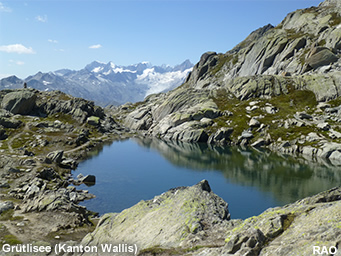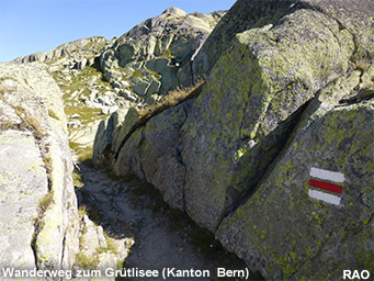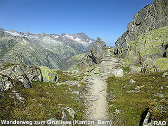 Der Weg von der Grimsel Passhöhe hinauf zum Grütlisee wurde mehrheitlich entlang der Kantonsgrenze auf dem Gebiet des Kantons Bern angelegt. Kurz vor dem Grütlisee überquert er die Grenze zum Kanton Wallis.