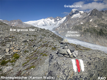 Wer einen besseren Blick auf den Rhonegletscher haben will, muss vom Grütlisee auf dem Bergwanderweg der Talflanke entlang bis zum «Bim grosse Stei» wandern. Der Wanderweg führt vor allem gleich nach dem Grütlisee über einen mit Felsblöcken übersäten Abhang. Der Weg ist nicht immer gut sichtbar. Wer den rotweissen Wegmarkierungen auf dem Felsblöcken folgt, wird den richtigen Weg finden.