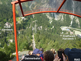 Das Wandergebiet um den Gelmersee erreicht mit der Gelmerbahn. Die Talstation der Gelmerbahn liegt auf der anderen Talseite nur wenige Gehminuten vom «Hotel Handeck» an der Grimselpassstrasse entfernt. Das Hotel, die Gelmerbahn und der Stausee gehören der Kraftwerke Oberhasli KOW.