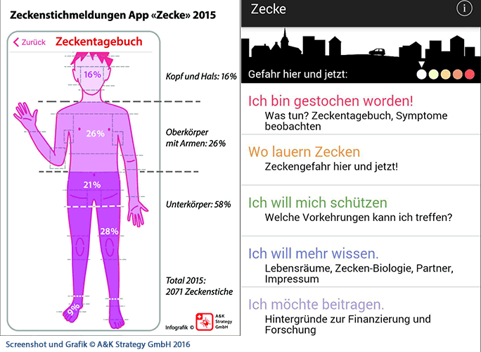 Die kostenlose Präventions-App «Zecke» wurde von der ZHAW in Wädenswil zusammen mit der Andreas Garzotto GmbH in Winterthur vorerst als iOS-Version entwickelt. Neu steht auch eine Android-Version zur Verfügung. Das erste Betriebsjahr zeigt, dass das mobile Tagebuch zur Überwachung von entdeckten Zeckenstichen intensiv genutzt wurde. Anonym über das Zeckentagebuch erfasste Zeckenstiche enthalten den geografischen Stichort und die Körperstichstelle. Die App erinnert anhand des Tagebucheintrags die betroffene Person nach fünf, zehn und 28 Tagen mit Borreliose-Symptombeschrieben an den Zeckenstich. Trifft ein beschriebenes Symptom auf den erfassten Zeckenstich zu, wird ein Arztbesuch zur raschen medizinischen Behandlung empfohlen.