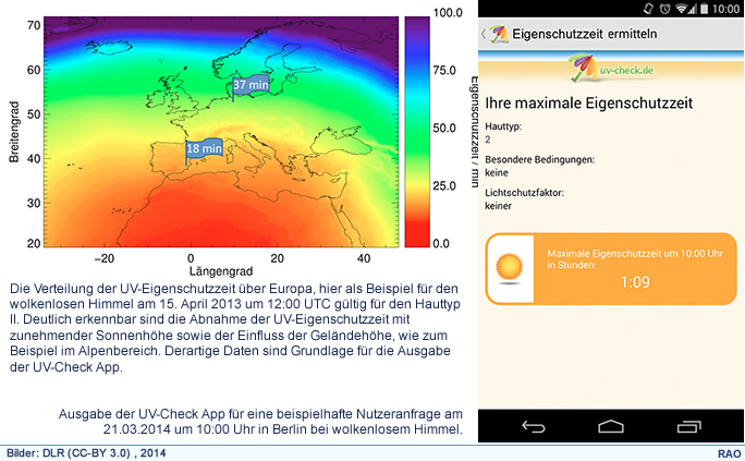 Sonnenbrände sind eine Hauptursache für irreparable Hautschäden und die Entstehung von Hautkrebs. Wissenschaftler des Deutschen Zentrums für Luft-und Raumfahrt (DLR) entwickelten gemeinsam mit dem Berufsverband der Deutschen Dermatologen (BVDD) die UV-Check App für Smartphones. Über das Mobiltelefon kann der Nutzer mit der neuen App schnell seine individuelle UV-Eigenschutzzeit zu jeder Zeit und an jedem beliebigen Ort in Europa abrufen und sich somit vor einer zu hohen UV-Dosis schützen.