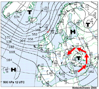 Bild der Höhenströmung verdeutlicht, wie das Tief, das im Gegenuhrzeigersinn