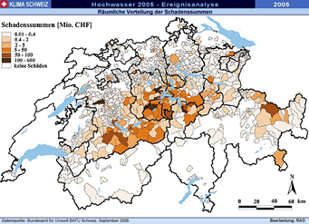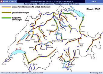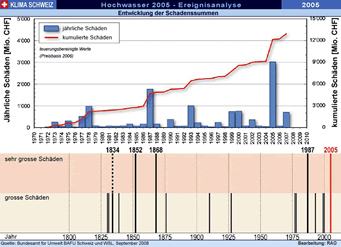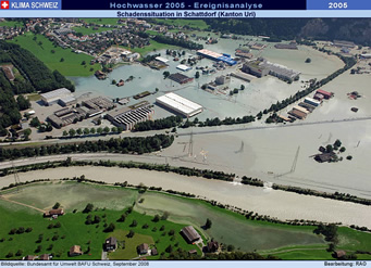 August 2005 ( Die Analyse des Hochwassers 2005 unter Leitung des Bundesamt für Umwelt BAFU und der Eidg. Forschungsanstalt für Wald, Schnee und Landschaft WSL zeigt, dass lokal zwar rekordhohe Niederschläge und Abflüsse gemessen wurden, das Ereignis in seiner Gesamtheit und über einen längeren Zeitraum betrachtet zwar selten, aber nicht einmalig ist. "Vergleichbare - und vielleicht noch stärkere - Ereignisse kann es auch in Zukunft geben", schreibt Bundesrat Moritz Leuenberger im Vorwort zum Synthesebericht der Ereignisanalyse, und folgert: "Um zu verhindern, dass sie ähnliche oder sogar noch schlimmere Folgen haben als im August 2005, ist die konsequente Fortsetzung einer umfassenden Hochwasserschutzpolitik notwendig".