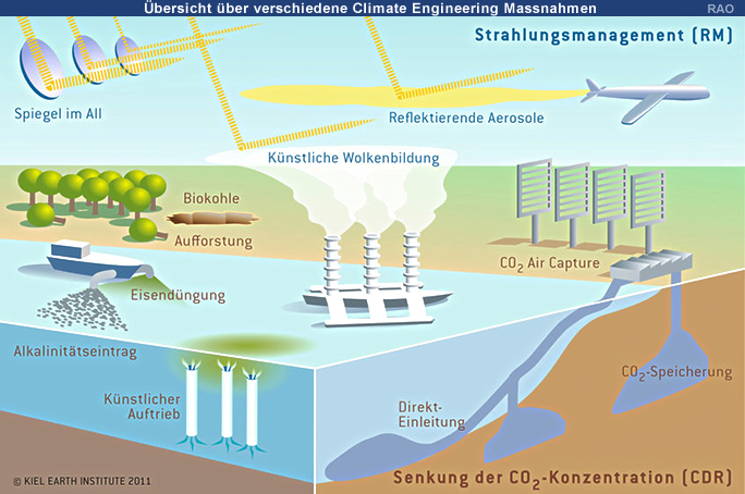 Der einfachste Weg wäre theoretisch, die Emissionen von Kohlendioxid CO2 schnell wieder zu verringern. Doch bei einer rasant wachsenden Weltbevölkerung und dem aktuellen Industrialisierungsschub in grossen Schwellenländern erweist er sich in der Praxis als schwierig. Deshalb werden vermehrt grosstechnische Massnahmen in die Diskussion eingebracht. Sie sollen gezielt eingesetzt werden, um die atmosphärische CO2-Konzentration abzusenken oder die einfallende Sonnenstrahlung abzuschwächen. "Diese grosstechnischen Massnahmen fasst man unter dem Begriff "Climate Engineering" zusammen", erklärt Professor Andreas Oschlies vom GEOMAR Helmholtz-Zentrum für Ozeanforschung Kiel. "Doch bislang gibt es weder verlässliche Informationen über die Potenziale dieser Massnahmen, noch über Nebenwirkungen", so Oschlies weiter.