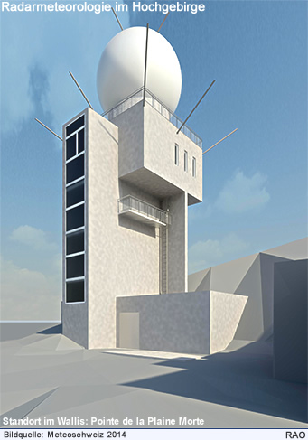Das Bundesamt für Meteorologie und Klimatologie MeteoSchweiz hat den gesetzlichen Auftrag die Wetterentwicklung in der Schweiz zu überwachen und die Schweizer Bevölkerung, Kantone sowie Alarmorganisationen vor gefährlichen Wetterereignissen zu warnen. Als nationaler Wetter- und Klimadienst betreibt MeteoSchweiz deswegen ein Wetterradarnetzwerk, welches Niederschlag und Gewitter flächendeckend und in Echtzeit für die Schweiz überwacht. Die drei bestehenden Radaranlagen auf dem Albis für die Nordschweiz, dem Monte Lema im Tessin und dem La Dôle in der Westschweiz decken die Schweiz weitgehend ab, reichen jedoch nicht aus, um Niederschläge im Zentralwallis und in Graubünden genau zu erfassen. Zu hoch sind die Berge in diesen Regionen und versperren den bestehenden Radaranlagen den Blick. |