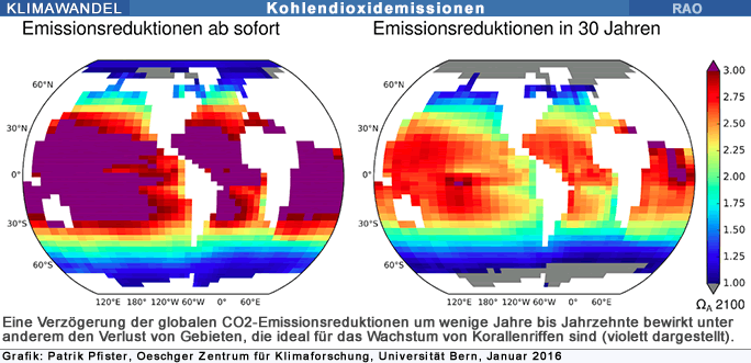 Gleichzeitig erhöhen andauernde Emissionen auch die Versauerung der Meere - mit erheblichen Folgen für Meeresökosysteme. Gemäss Berechnungen des Berner Klimamodells bewirkt die Versauerung zum Beispiel, dass Ozeanregionen mit chemisch idealen Bedingungen für das Korallenwachstum rapide schrumpfen. Solche Regionen verschwinden bis zum Ende des Jahrhunderts fast vollständig, wenn die Emissionsreduktionen um wenige Jahre bis Jahrzehnte verzögert werden.