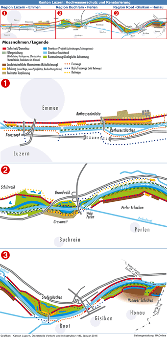 dienststelle Verkehr und Infrastruktur (vif) informiert die Bevölkerung der betroffenen Gemeinden in den nächsten Tagen an öffentlichen Veranstaltungen über das Projekt. Ab dem 19. Januar 2015 finden die Einwohnerinnen und Einwohner von Emmen, Ebikon, Root, Buchrain, Gisikon, Honau, Eschenbach und Inwil zudem eine Projektzeitung in ihren Briefkästen. Diese enthält alle wichtigen Informationen zum Projekt sowie eine detaillierte, illustrierte Übersicht über die geplanten Massnahmen. Über den aktuellen Stand des Projekts informiert die Website www.reuss.lu.ch.
