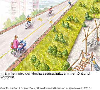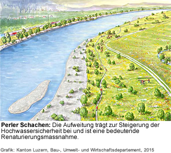 Neue Dämme, Aufweitungen und Entlastungen erzielen eine nachhaltige Hochwassersicherheit. Zudem wird die von den eidgenössischen und kantonalen Gesetzen geforderte naturnahe Ausgestaltung umgesetzt.