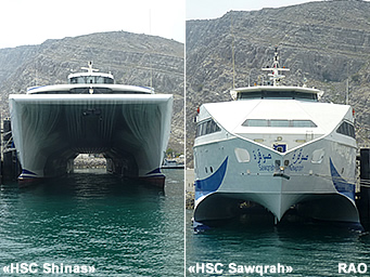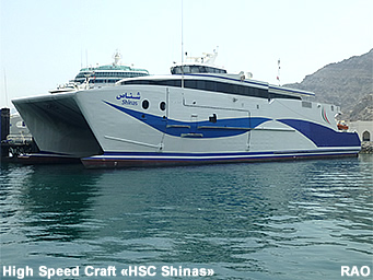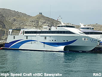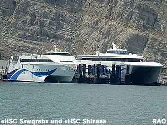 Khasab und Dibba al Bay'ah werden von den National Ferries Company NFC mit Hochgeschwindigkeit-Fährschiffen im Linienverkehr angelaufen. Die Schiffe fahren teilweise mit einer Geschwindigkeit von über 100 km/h. Das 2008 in Dienst gestellte Hochgeschwindigkeit-Fährschiff «HSC Hormuz» (HSC = High Speed Craft) benötigt für die 225 nautische Meilen (ca. 415 km) messende Strecke von Maskat nach Khasab rund 5 Stunden. Die Strecke Maskat - Khasab gilt weltweit als die längste Strecke, welche von einem Hochgeschwindigkeitsfährschiff regelmässig befahren wird. Die «HSC Hormuz» ist 65 m lang und kann 200 Passagiere und 56 Motorfahrzeuge aufnehmen. «HSC Hormuz» fährt gegenwärtig (ab Oktober 2014) an drei Wochentagen (So, Mo, Do) von Maskat nach Khasab an an drei Wochentagen (Di, Mi, Sa) wieder zurück. Am Freitag gibt es momentan keine Verbindungen von oder nach Maskat. 5 Fahrten pro Woche werden auf der Route Shinas - Khasab - Shinas (Fährdienst durch «HSC Shinas», Schwesterschiff der «HSC Hormuz») ausgeführt, 4 Fahrten auf der Route Khasab - Lima - Khasab (Fährdienst durch «HSC Sawqrah», 52 m lang, 100 Passagiere und 22 PKWs ) sowie 3 Fahrten auf der Strecke Shinas - Dibba - Khasab (Fährdienst durch «HSC Masirah-4»). Die Fahrt von Dibba nach Khasab dauert rund 2,5 Stunden.