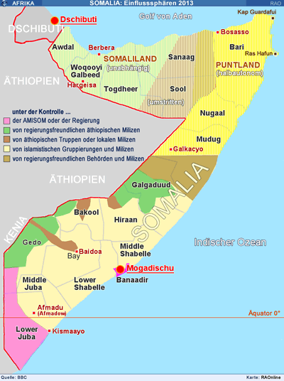 Die von den Vereinten Nationen UNO und den Truppen der Afrikanischen Union AMISOM unterstützte Regierung kontrollierte 2013 nur wenige Gebiete des Landes. Die Hauptstadt Mogadischu und die südliche Grenze zu Kenia wurde 2013 von Soldaten der AWISOM kontrolliert und bewacht. AMISOM wurde immer wieder in Gefechte mit islamischen Milizen wie der Al Shabaab verwickelt. Die islamistischen Gotteskrieger rächen sich immer wieder mit Terroranschlägen in den Herkunftsländer der Truppenkontingente wie Uganda oder Kenia. Die zentralen Grenzgebiete zu Äthiopien stehen unter dem Einfluss von äthiopischen Truppen oder Milizen.