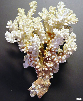 | Das Ausbleichen von Korallen findet dann statt, wenn Korallen Änderungen in ihrem Lebensraum unterworfen sind. Die Änderung der Wassertemperatur, dem Lichteinfall, der Nahrung, die Wasserversauerung usw. setzt die Koralle so unter Stress, dass sie eine mit ihr lebende Algenart aus ihrem Gewebe abstösst. Die einzelligen Algen (Zooxanthellen) leben im Gewebe der Korallen und tragen durch ihre Photosynthese zum Wachstum der Korallentieren bei. Ohne diese Algen wachsen die Korallen langsamer. In Tuvalu im tropischen Pazifik wächst eine Koralle unter günstigen Voraussetzungen nur gegen 2 mm pro Jahr. Korallen wachsen im Durchschnitt zwischen 2 bis 30 Millimeter pro Jahr