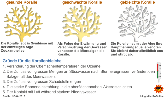 Korallen haben eine geringe Toleranz gegenüber Temperaturschwankungen. Mit einem Anstieg der Oberflächentemperaturen der Weltmeere wird die Temperaturgrenze überschritten und das Ausbleichen von Korallenriffen setzt ein. Die höheren Wassertemperaturen und der Anstieg des Säuregehalts des Meerwassers (Ozeanversauerung) durch die Aufnahme des Treibhausgases Kohlendioxid CO2 lassen einstmals farbige Korallen allmählich ausbleichen und absterben. Die höheren Wassertemperaturen und die Wasserversauerung sind die Folgen des Klimawandels, der nach Ansicht von Wissenschaftler hauptsächlich auf den Anstieg der CO2-Emissionen durch menschliche Aktivitäten zurückzuführen ist. Weltweit sind gegenwärtig rund zwei Drittel aller Korallenriffe durch den zunehmenden CO2-Gehalt des Meerwassers vom Aussterben bedroht.