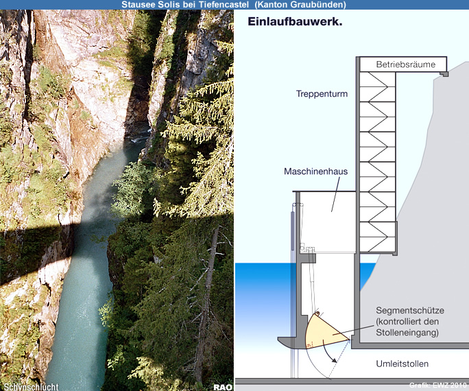 Die im Jahre 1986 fertig gebaute, 61 m hohe Bogenstaumauer Solis staut die Albula oberhalb der Schynschlucht zu einem knapp 3 km langen See.
