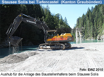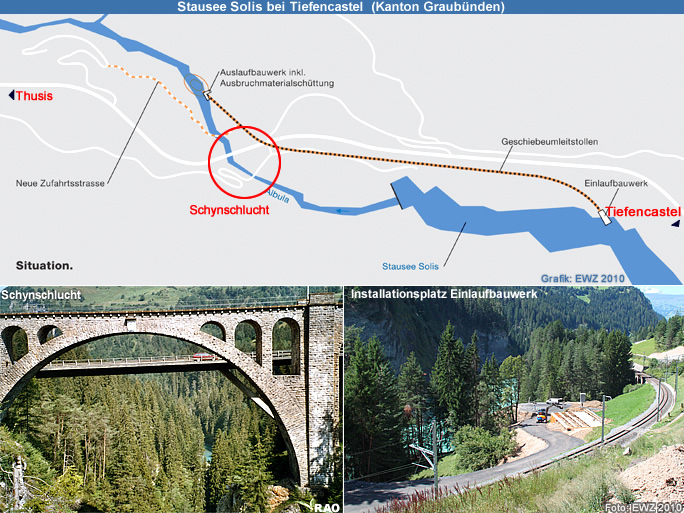 Die Verlandung des Stausees Solis (Auffüllung von Gewässern mit Geschiebe) ist ein Problem, das jetzt mit einem 850 Meter langen Geschiebeumleitstollen gelöst wird. Am 9. September 2010 fällt mit einer Sprengung der offizielle Startschuss für das 38,4 Mio. Franken teure Bauvorhaben. Die Bauarbeiten dauern voraussichtlich bis 2012.
