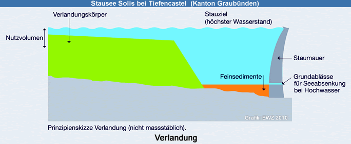 Der immer wachsende Verlandungskörper (siehe Grafik) verringert das Speichervolumen und erschwert damit die Bewirtschaftung des Stausees Solis. |