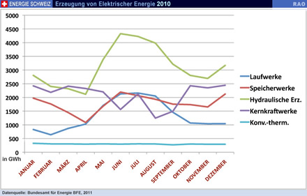 Die Wasserkraftanlagen (Laufkraftwerke und Speicherkraftwerke) erzeugten 0,8% mehr Elektrizität als im Vorjahr. Die Produktion der Laufkraftwerke nahm um 0,5% ab, diejenige der Speicherkraftwerke stieg um 1,9%. Die Produktion der Wasserkraftwerke sank im Sommer 2010 um 8,4% gegenüber dem Vorjahr. In den beiden Winterquartalen erhöhte sich die Produktion der Wasserkraftwerke um 16,5%, wobei vor allem das 4. Quartal 2010 eine markant höhere Produktion als im Vorjahr verzeichnete (+ 30,7%). Die Produktion der Speicherkraftwerke steigen im 4. Quartal sogar um 41,5%.