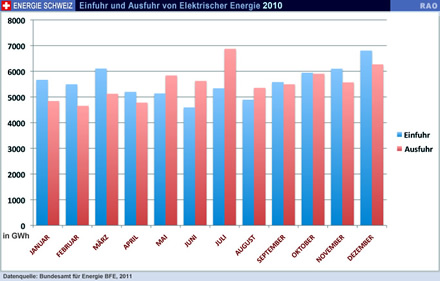 | Während sechs Monaten des Jahres 2010 überstieg die Landeserzeugung den Inlandbedarf (Landesverbrauch). Für das ganze Jahr ergab sich bei Importen von 66,8 Mrd. kWh und Exporten von 66,3 Mrd. kWh ein Importüberschuss von 0,5 Mrd. kWh (2009: Exportüberschuss von 2,2 Mrd. kWh). Damit verzeichnet die Schweiz zum dritten Mal nach 2005 und 2006 einem Importüberschuss. |