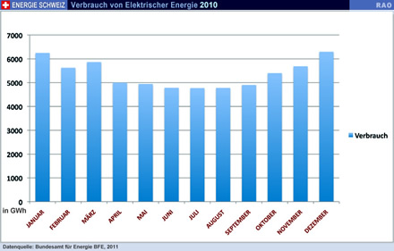 Der schweizerische Elektrizitätsverbrauch (Endverbrauch = Landesverbrauch nach Abzug von Übertragungs- und Verteilverlusten) stieg im Jahr 2010 um 4,0% auf 59,8 Mrd. kWh (2009: 57,5 Mrd. kWh). Mit Ausnahme des Monats Januar lag der Elektrizitätsverbrauch der Schweiz in jedem Monat des Jahres 2010 zwischen 1,9% und 6,8% über dem entsprechenden Vorjahreswert. Die höchste Zuwachsrate ergab sich im zweiten Quartal mit 6,2%, in den übrigen Quartalen stieg der Stromverbrauch gegenüber dem Vorjahr um 2,0% (1. Quartal), 3,2% (3. Quartal) und 4,9% (4. Quartal).
