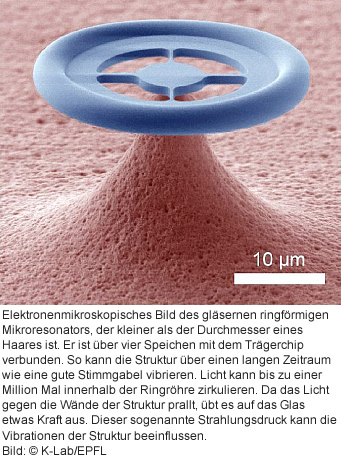 Obwohl dieser Druck sehr schwach ist, wächst die Kraft in der Ringröhre beträchtlich an: Das Licht zirkuliert bis zu einer Million Mal in der Struktur, bevor es sich verliert. So kann der Strahlungsdruck dazu führen, dass sich die Struktur bewegt. Der Mikroresonator vibriert, so wie ein Weinglas zu tönen beginnt, wenn man mit einem Finger an dessen Fassung entlangstreicht. Das Laserlicht kann die Vibrationen aber auch abschwächen und den Mikroresonator abkühlen.