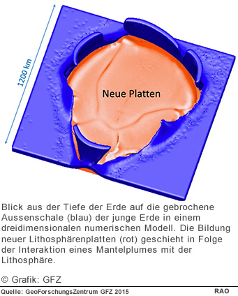 Wahrscheinlich, so Sobolev, war es nicht ein einzelner Mantelplume, der den Prozess der Plattentektonik in Gang setzte, sondern das Zusammenwirken vieler solcher aufsteigender heisser Mantelströmungen. Das brodelnde Innenleben unseres einzigartigen Planeten führte dazu, dass sich einige dieser plattentektonischen Fenster vereinigten und der Vorgang sich zur globalen Plattentektonik entwickelte.