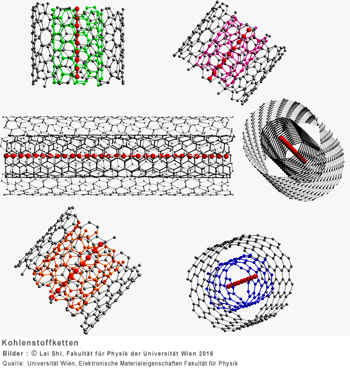 Die ForscherInnen der Universität Wien erarbeiteten eine neue Methode, mit der sie in der Lage sind, Kohlenstoffketten mit einer noch nie dagewesenen Länge von bis zu 6'000 Kohlenstoffatomen herzustellen, welche sich damit im Bereich von Mikrometern bewegt. Dafür benützten sie doppelwandige Kohlenstoffnanoröhren als Schutzschild und "Nano-Brutkasten", um innerhalb ihrer Hohlräume Kohlenstoffketten in makroskopischem Ausmass wachsen zu lassen.