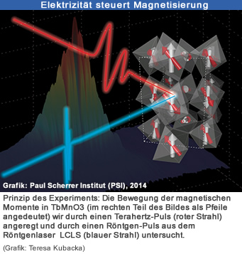 Nun haben Forschende des Paul Scherrer Instituts PSI und der ETH Zürich das Material TbMnO3 untersucht und gezeigt, dass sich seine Magnetisierung durch ein elektrisches Feld in Zeiträumen von Pikosekunden (10-12 s = der millionste Teil einer Millionstelsekunde) verändern lassen, was wesentlich kürzer ist als die Zeiten, in denen heutige Festplatten umgeschaltet werden. "Damit ist gezeigt, dass multiferroische Materialien elektrisch schnell genug geschaltet werden können, um in Magnetspeichern eingesetzt zu werden", erklärt Urs Staub, Forschungsgruppenleiter am PSI und einer der Leiter des Forschungsprojekts. "Das elektrische Schalten könnte zahlreiche Vorteile haben. Um ein magnetisches Feld zu erzeugen, braucht man eine Spule, durch die ein Strom fliesst. Ein elektrisches Feld lässt sich ohne Strom erzeugen.