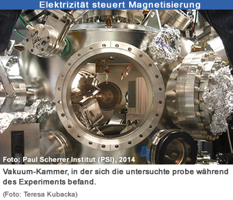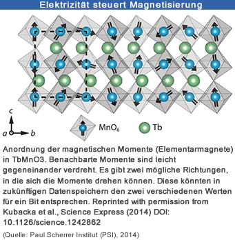 Einfacher als ein magnetisches Feld lässt sich auf kleinem Raum ein elektrisches Feld erzeugen, sodass man im Prinzip kleinere Speicher bauen könnte, wenn die Magnetisierung mit elektrischen Feldern geschaltet werden könnte. Eine entsprechende Verknüpfung von magnetischen und elektrischen Eigenschaften zeigen sogenannte multiferroische Materialien, die seit einigen Jahren zu den aktuellsten Themen der Materialforschung gehören.