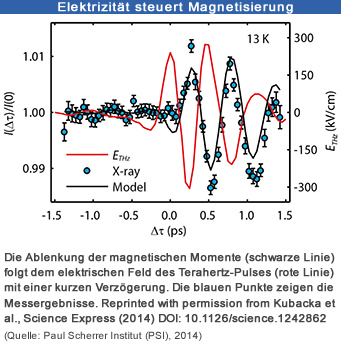 Mit dem elektrischen Wechselfeld des Terahertzpulses haben sie die elektrische Polarisation beeinflusst und beobachtet, inwieweit die magnetische Ordnung dem Wechselfeld folgt. Dabei war das Feld zu schwach, um die Magnetreihe tatsächlich um 180° zu drehen und "auf den Kopf" zu stellen, aber man konnte beobachten, dass sie im Takt des elektrischen Feldes um etwa 4° ausgelenkt wurde.