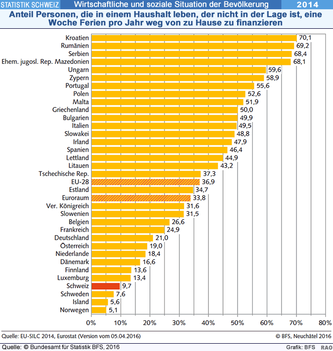 Der Lebensstandard in der Schweiz gehört weiterhin zu den höchsten in Europa Die Schweiz war 2014 eines der Länder mit dem höchsten Lebensstandard in Europa. Dies schliesst wirtschaftliche Schwierigkeiten nicht aus: So waren 6,6 Prozent der Bevölkerung oder rund 530'000 Personen von Einkommensarmut betroffen. Fast jede zehnte Person verfügte nicht über die Mittel, eine Woche Ferien weg von zu Hause zu finanzieren. Dies geht aus der Erhebung über die Einkommen und die Lebensbedingungen (SILC) des Bundesamtes für Statistik (BFS) hervor.
