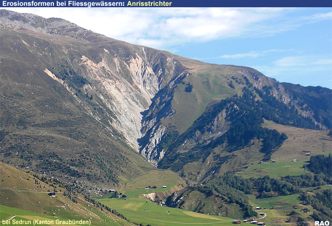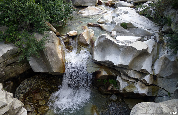 Nach heftigen Gewitterschauern steigt der Wasserspiegel in den engen, V-förmigen Seitentälern ohne Seen rasch stark an. Die Bäche führen dabei viel Schutt und Geröll mit sich.
