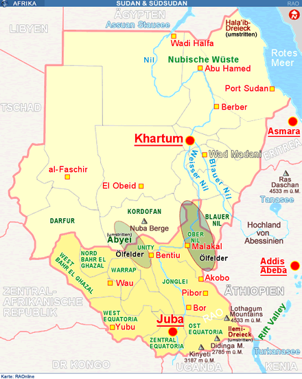 Die Lager für die Vertriebenen wurden westlich und östlich des Niltales von Juba im Süden bis Bentiu und Malakal eingerichet. Vor allem im Norden in der Grenzregion zum Sudan sind die Flüchtlingslager wegen Kampfhandlungen für die Helfer nicht oder kaum erreichbar.