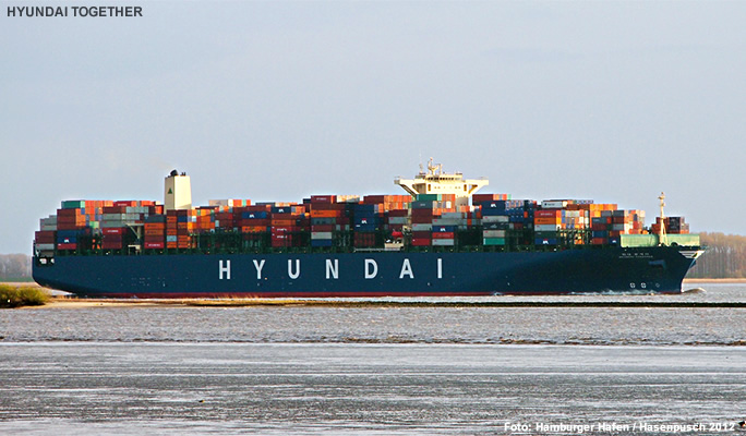 | Vom 14.bis zum 16. April 2012 wurde am Container Terminal Altenwerder (CTA) im Hamburger Hafen erstmals ein Containerschiff mit einer Stellplatzkapazität von 13'000 Standardcontainern (TEU) abgefertigt. Die "Hyundai Together" der südkoreanischen Reederei Hyundai verkehrt im Asien-Europa-Loop 4 der G6 Alliance. |