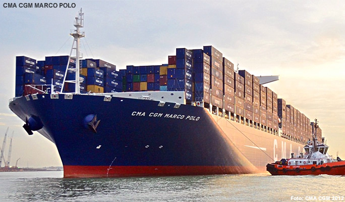 | Am 12. Dezember 2012 hat die "CMA CGM Marco Polo" der französischen Reederei CMA CGM als ersten kontinentaleuropäischen Hafen den Hamburger Hafen angelaufen. Das Grossschiff mit Platz für 16'020 Standardcontainer wird am HHLA Container Terminal Burchardkai abgefertigt. Die "Marco Polo" ist 396 Meter lang und 53,6 Meter breit. Das grösste Containerschiff der Welt verkehrt im FAL1-Dienst auf der bedeutendsten internationalen Handelsroute zwischen Fernost und Nordeuropa. |