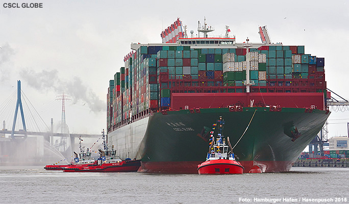 | Mit der CSCL GLOBE der chinesischen Reederei China Shipping Container Lines wurde vom 13.-15. Januar 2015 erstmals ein 19'100 TEU Schiff im Hamburger Hafen abgefertigt.Die "GLOBE" ist 399,7 Meter lang, 58,6 Meter breit und hat eien Tiefgang von 16 Metern.. Das grösste Containerschiff der Welt verkehrt im Liniendienst AEX-1 der CSCL zwischen Fernost und Nordeuropa. |