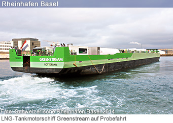 Am 29./30. November 2014 legte im Hafen Birsfelden zum ersten Mal das mit LNG (Flüssigerdgas) betriebene Tankschiff Greenstream an.