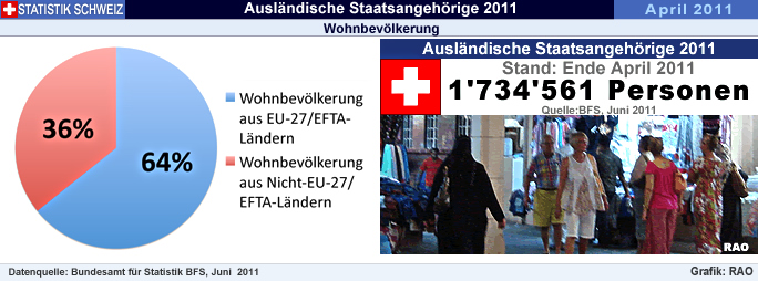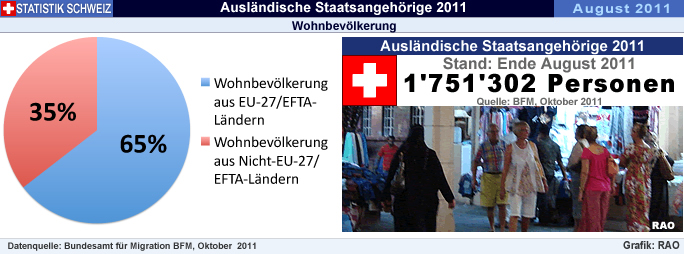 Ende August 2011 betrug die ständige ausländische Wohnbevölkerung aus EU-27/EFTA-Ländern 1 129 638 Personen, das sind 4,0 Prozent mehr als Ende August 2010. Die Zahl der Ausländerinnen und Ausländer aus Nicht-EU-Staaten nahm im selbem Zeitraum um 0,8 Prozent zu. Ende August 2011 lebten neu insgesamt 1 751 301 Ausländerinnen und Ausländer in der Schweiz. Das sind 22,3 Prozent der gesamten Wohnbevölkerung.