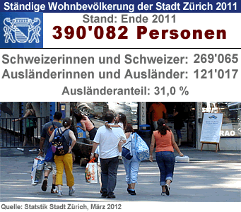 Der Anteil der Ausländerinnen und Ausländer an der Gesamtbevölkerung hat von 30,5 auf 31,0 Prozent zugenommen. Wie schon in den letzten Jahren ist die Zahl der Deutschen am stärksten gestiegen (+1247 Personen). Ende 2011 wohnten 31 124 Menschen mit deutschem Pass in Zürich. Auch die Zahl der Spanierinnen und Spanier (+260) sowie der Personen aus Eritrea (+240) und Grossbritannien (+237) hat zugelegt.