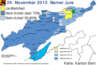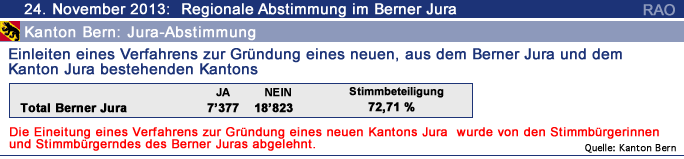 Die Bevölkerung des Berner Juras hat sich am 24. November 2013 in einer regionalen Abstimmung bei einer Stimmbeteiligung von 72,71 Prozent mit 18'823 NEIN zu 7'377 JA gegen das Einleiten eines Verfahrens zur Gründung eines neuen, aus dem Berner Jura und dem Kanton Jura bestehenden Kantons ausgesprochen. Die drei Mitglieder der Juradelegation des Regierungsrats - Regierungspräsident Christoph Neuhaus, Regierungsrat Philippe Perrenoud und Regierungsrat Bernhard Pulver - haben die Erklärung des Regierungsrats anlässlich der Bekanntgabe des Abstimmungsergebnisses im Regierungsstatthalteramt in Courtelary abgegeben.