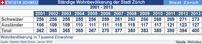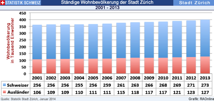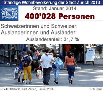 Am 22. Januar 2014 erreichte die Bevölkerungszahl Zürichs die 400 000er-Grenze: 400 028 Menschen sind in der Stadt als Einwohnerinnen und Einwohner angemeldet.
