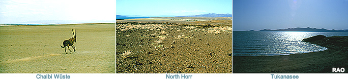 Der Norden Kenias ist wüstenartig. Es regnet in dieser Region sehr selten. Die Tagestemperaturen liegen12 Monate im Jahr zwischen25 - 35°C im Schatten. Die Durchquerung der Chalbi- und Kaisut-Wüsten erinnert stark an die Sahara. Lange, versandete Wadis (Trockenflusstäler) , flimmernde, von Sonne und Wind zerklüftete Regs (Steinwüsten). |