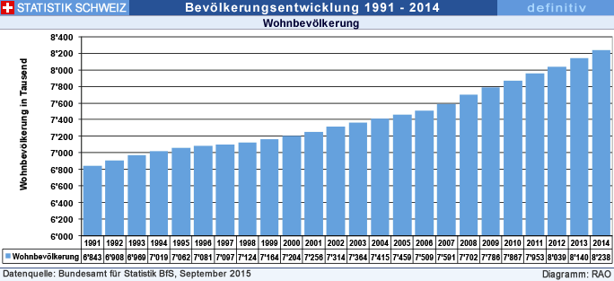 Ende 2014 zählte die ständige Wohnbevölkerung der Schweiz 8'237'666 Personen. Damit ist sie gegenüber 2013 um 98'000 Personen gewachsen (+1,2%). Diese Zunahme erklärt sich in erster Linie mit einem Wanderungssaldo - also einer Differenz zwischen Einwanderungen und Auswanderungen - von 76'223 Personen. Weitere Wachstumsfaktoren sind ein Geburtenüberschuss, d.h. die Differenz zwischen Geburten und Todesfällen, von 21'300 Personen und diverse statistische Bereinigungen (+500). Die Zunahme betrifft sowohl die Schweizerinnen und Schweizer (+37'000 Personen) als auch die ausländische Bevölkerung (+61'000).